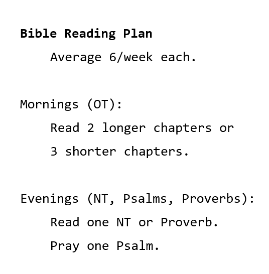 I’ve done a number of Bible reading plans since then. Come December, they are all the rage on the internet. I’ve settled on one I believe to work best for me (the wife uses it as well). I needed something low key, without all the box checking. I needed something I could keep up with if I fell behind. I also needed something that made sense to my mind.